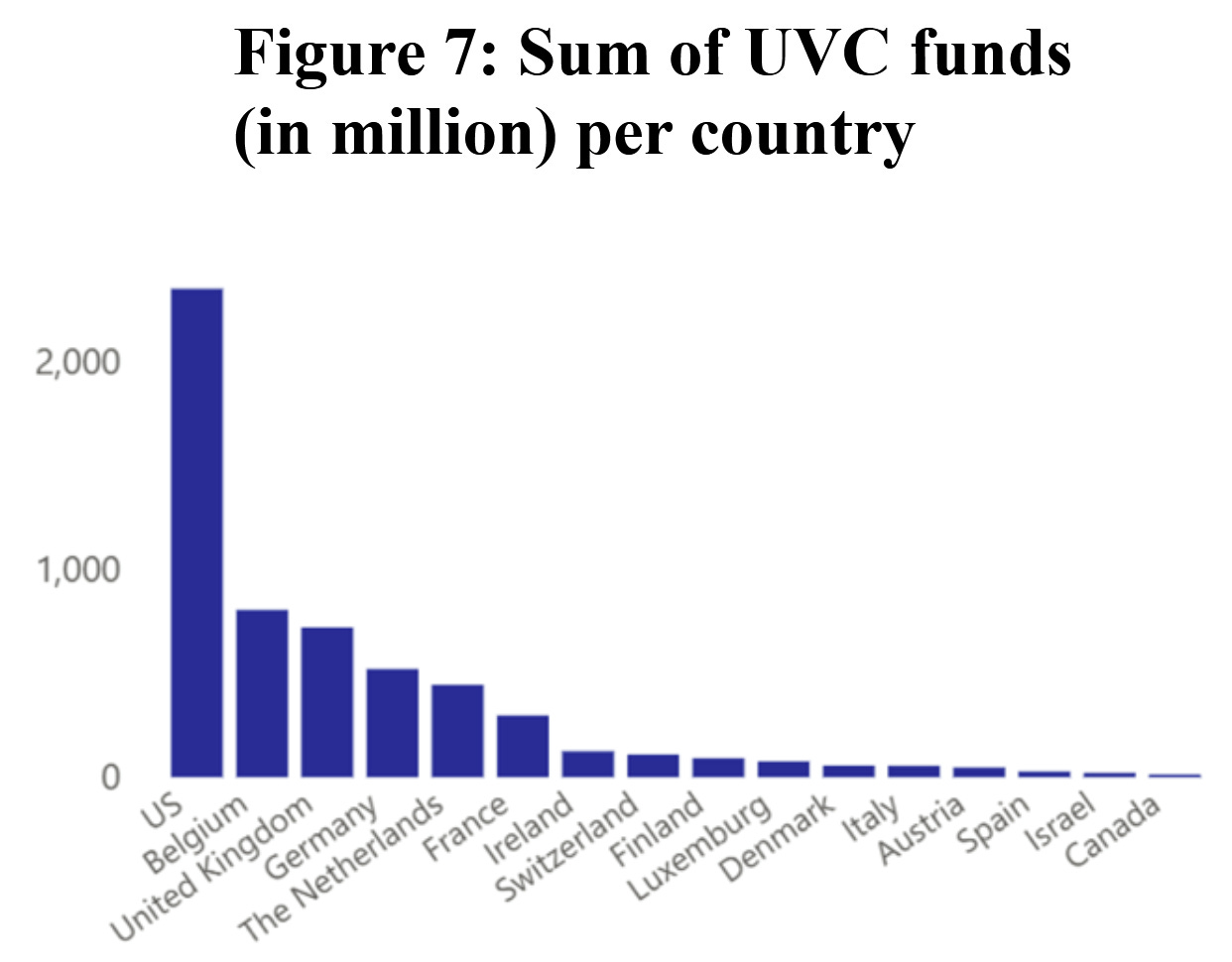 The results strongly support a recent report by the National Angel Capital Association (NACO) that demonstrated that Canada is missing 141M and $181M USD in pre-seed and seed-stage investment capital, respectively, relative to the United States, resulting in $66B in foregone economic value creation. Contributing to that gap, Crispeels et al. show, is that Canada sits in last place for total UVC among countries surveyed (see Figure 7, reproduced below).